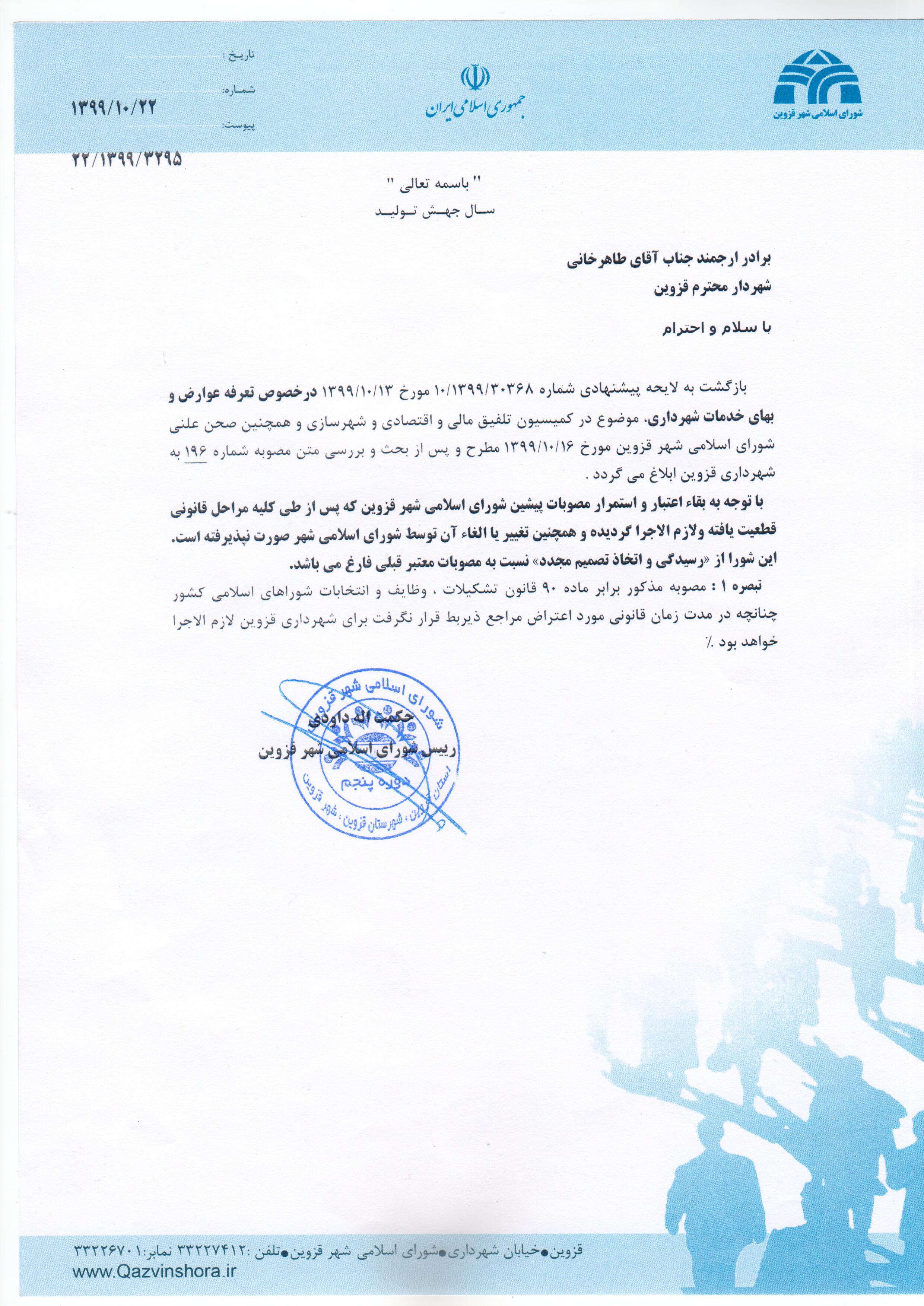 | | در خصوص تعرفه عوارض و بهای خدمات شهرداری | |