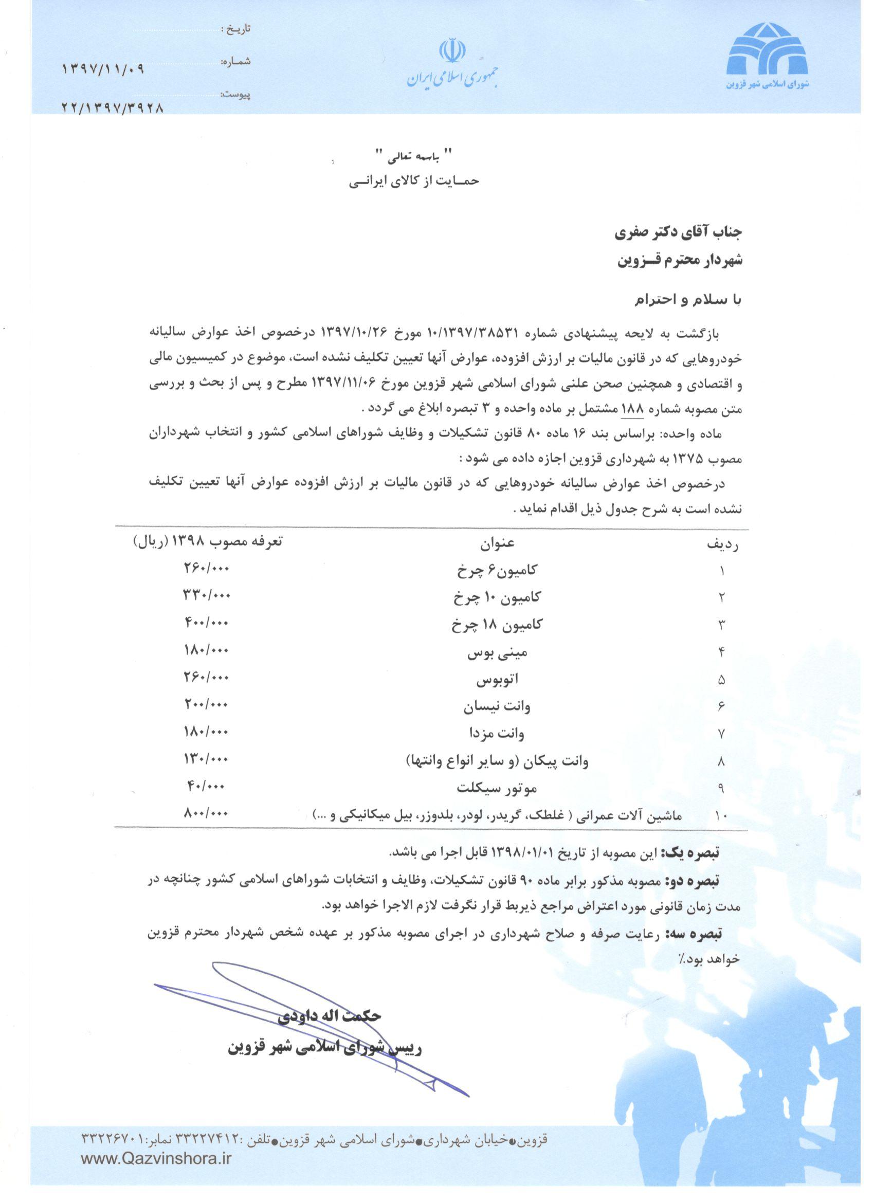 | مجموعه تعرفه عوارض و بهای خدمات شهرداری قزوین در سال 1398 | ||