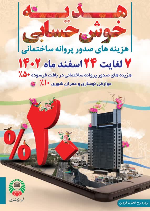 به گزارش روابط عمومی معاونت مالی و اقتصادی شهرداری قزوین؛ مسعود حاج نصراله ئی با اعلام این خبر افزود: به مناسبت اعیاد شعبانیه، از 7 تا 24 اسفند ماه سال جاری به شهروندان خوش حسابی که نسبت به پرداخت نقدي هزینه های صدور پروانه ساختمانی اقدام کنند، هدیه خوش حسابي 20 درصدی تعلق میگیرد.